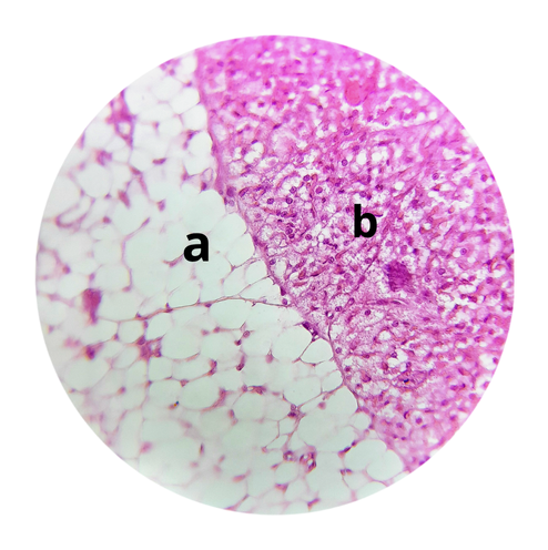 Adiposo unilocular e multilocular (HE-100X) (a) tecido adiposo unilocular(b) Tecido adiposo multilocular
