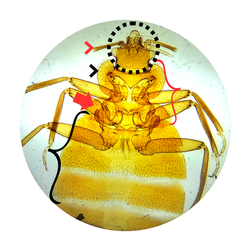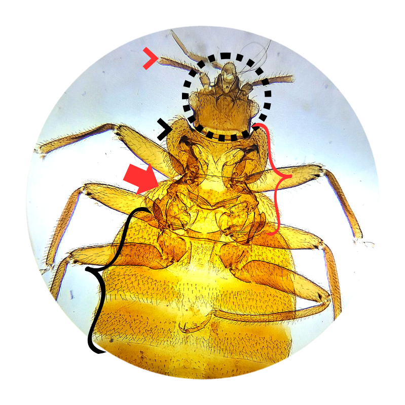 Cimex sp Comparação Fêmea (Círculo) cabeça(seta vermelha) antena(seta preta) pronoto(corpo seta vermelha) tórax(chave vermelha) tórax(chave preta) abdômen Macho (Círculo) cabeça(seta vermelha) antena(seta preta) pronoto(corpo seta vermelha) tórax(chave vermelha) tórax(chave preta) abdômen