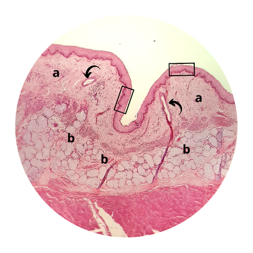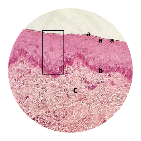 Epitélio estratificado pavimentoso Esôfago (HE-400X) (a) células epiteliais pavimentosas(retângulo) camada estratificada de céulas pavimentosas(b) membrana basal(c) tecido conjutivo subjacente Esôfago (HE-40X) (retângulo) camada de epitélio estratificado pavimentoso(seta) ducto(a) tecido conjuntivo – denso não modelado (b) glândulas mucosas