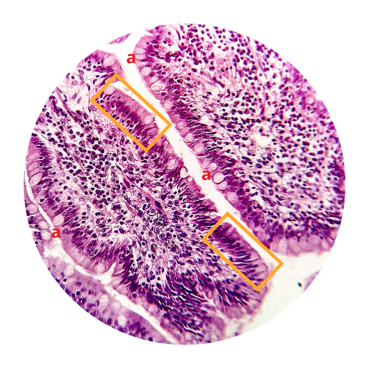Epitélio simples cilíndrico Lâmina Jejuno (HE-400X) (retângulo) células simples cilíndricas(a) células caliciformes