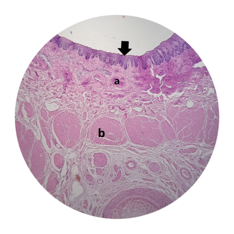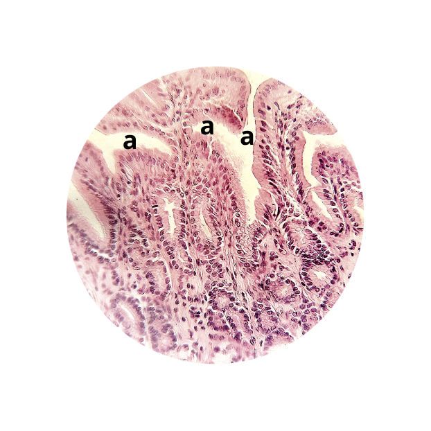 (a) epitélio simples cilíndrico – presença de glândulas gástricas tubulares