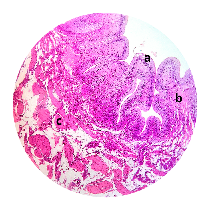 (a) epitélio de transição e presença do epitélio estratificado cilíndrico